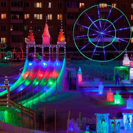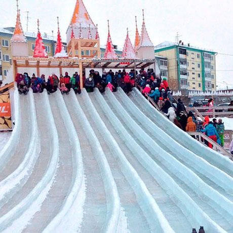 Уникальные многоскатные ледяные горки. Практически бобслейная трасса. Множество спусков разных направлений и протяженности.